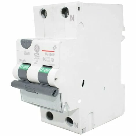 Disjoncteur différentiel General Electric 2 modules, connexion DIN (universel pour tout tableau du marché), 1P+N, 25 ampères, pouvoir de coupure 6kA, tension 30 mA, courant différentiel Idn 0,03A, type A, courbe de déclenchement C.
