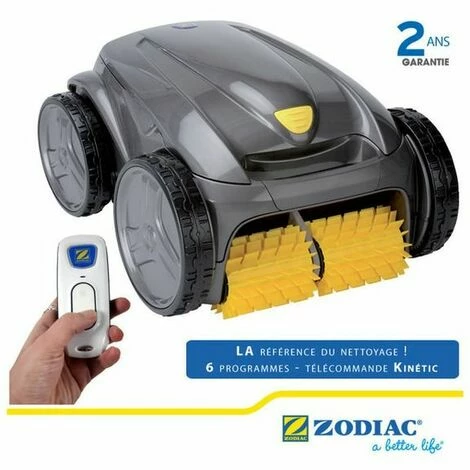 Le robot électrique OV3500 est idéal pour nettoyer les piscines de 15×8, convient à tous les fonds et revêtements. Zodiac vous propose 6 cycles de nettoyages : trois cycles du fond en 1h, 1h30 ou 2h et trois cycles complets de 2h, 2h30 et 3h. Grâce à la télécommande (incluse) vous pouvez contrôler votre robot manuellement à distance. Le système de nettoyage du OV3500 permet d’obtenir une puissance d’aspiration qui ne faiblis pas : la modification de l’inclinaison des moteurs induit la création d’un tourbillon dans le bac à filtration, les débris sont donc maintenus en lévitation- évitant l’encrassage du filtre. Sa puissance d’aspiration et supérieur de 30% par rapport aux robots nettoyeurs classiques. La technologie Activ Motion Sensor : Le robot nettoyeur Zodiac corrige sa trajectoire automatiquement et se déplace intelligemment afin d’optimiser son cycle au maximum. Pour lancer votre robot : Branchez le câble du boitier de commande au robot puis à une prise de courant. Pour votre sécurité, le boitier doit se trouver à trois mètres de la piscine. Assurez-vous que le câble ne soit pas emmêlé. Ensuite posez le robot électrique dans l’eau et laissez-le couler jusqu’au fond du bassin. Vous pouvez enclencher le cycle de nettoyage à partir du boitier. Laissez le Vortex OV3300 effectuer son cycle. Une fois le nettoyage terminé le moteur du robot s’arrêtera automatiquement. Pensez à éteindre le robot, ensuite débranchez le câble de l’alimentation, ramenez le robot vers le bord (à l’aide du câble), saisissez la poignée pour le remonter et laissez-le se vider de son eau. Il est prêt à ranger sur le chariot inclus ! Rincez le panier filtrant après utilisation, à l’eau claire. Ne pas se baigner lorsque le robot est dans la piscine. Vous pouvez maintenant profitez d’une eau propre grâce au Robot électrique Vortex OX3300 Zodiac ! *La mise en place de pneus spécifiques est nécessaire pour le revêtement carrelage et les coques polyester. – Le robot électrique OV3500 est idéal pour nettoyer les piscines de 15×8 – 6 cycles de nettoyages : trois cycles du fond en 1h, 1h30 ou 2h et trois cycles complets de 2h, 2h30 et 3h – Grâce à la télécommande (incluse) vous pouvez contrôler votre robot manuellement à distance – La technologie Activ Motion Sensor : Le robot nettoyeur Zodiac corrige sa trajectoire automatiquement et se déplace intelligemment afin d’optimiser son cycle au maximum